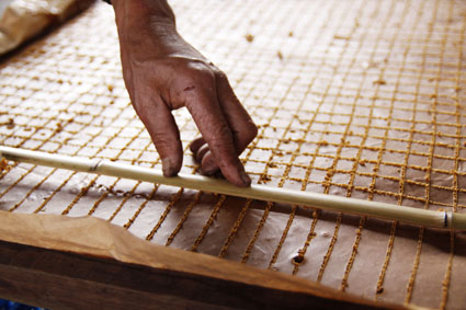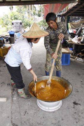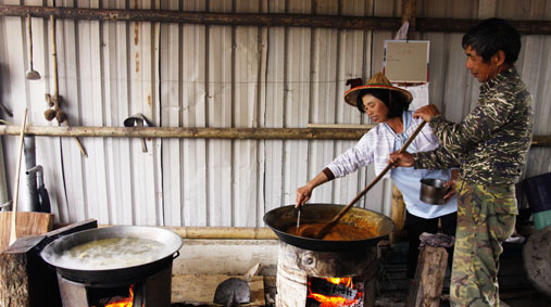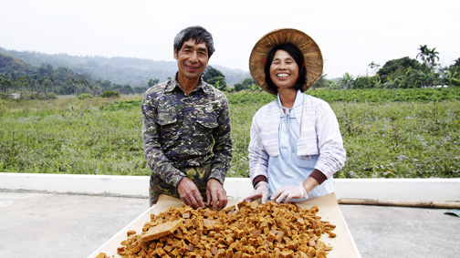 每年11月到隔年4月是甘蔗的產季,素琴夫婦倆每天去自家的甘蔗園現砍現煮,從砍、削皮、榨汁(剩下的甘蔗渣要再丟回到甘蔗園裡,化做春泥更護「甘蔗」)、熬煮,每次要花4-5小時才能將150斤的有機甘蔗熬煮成11斤的黑糖,柴燒的過程中,眼睛常常燻得難受,但倆人卻不以為意。在熬煮的過程中,還得三不五時加以攪拌、撈起雜質,尤其在最後一小時、煮到有稠度的時候,聞起來像烤地瓜、看起來像熔漿,需要不斷攪拌不能停,太熱會焦掉、不夠熱就變成麥芽糖,無法凝結成塊。