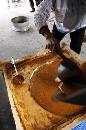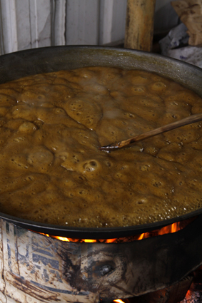 這張圖剛好用來對照,左邊那鍋甘蔗汁剛煮不久,仍是淡黃色,煮了三四小時後,就變成右邊土黃色這一鍋(左邊牆上掛的是過篩用的工具-竹子與絲瓜的合體,素琴阿姨拿它來撈除雜質)